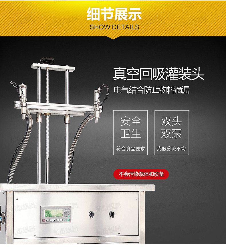 3.電氣結(jié)合----設(shè)計真空回吸灌裝頭,防止物料滴漏,不會污染瓶體和設(shè)備。