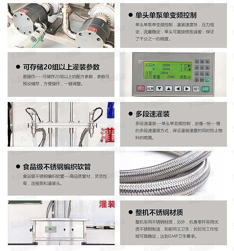 1.灌裝范圍廣、速度快、精度高-----1-20L大容量灌裝范圍,單頭單泵單變頻控制,灌裝速度快,壓力恒定,流量穩(wěn)定,單頭可直接修改誤差,保證了千分之一的精度。