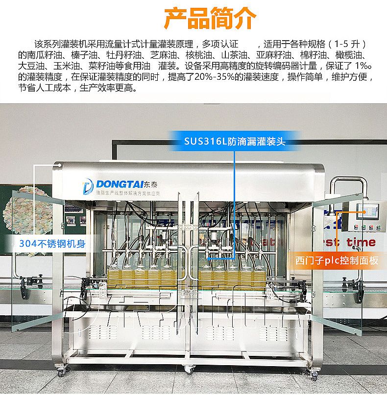 該系列灌裝機(jī)采用流量計(jì)式計(jì)量灌裝原理,多項(xiàng)技術(shù)認(rèn)證,適用于各種規(guī)格(1-5升)的南瓜籽油、榛子油、牡丹籽油、芝麻油、山茶油、亞麻籽油、棉籽油、橄欖油、大豆油、玉米油、菜籽油等食用油灌裝。設(shè)備采用高精度的旋轉(zhuǎn)編碼器計(jì)量,保證了1%的灌裝精度,在保證灌裝精度的同時(shí),提高了20%-35%的灌裝速度,操作簡(jiǎn)單,維護(hù)方便,節(jié)約人工成本,生產(chǎn)效率更高。
