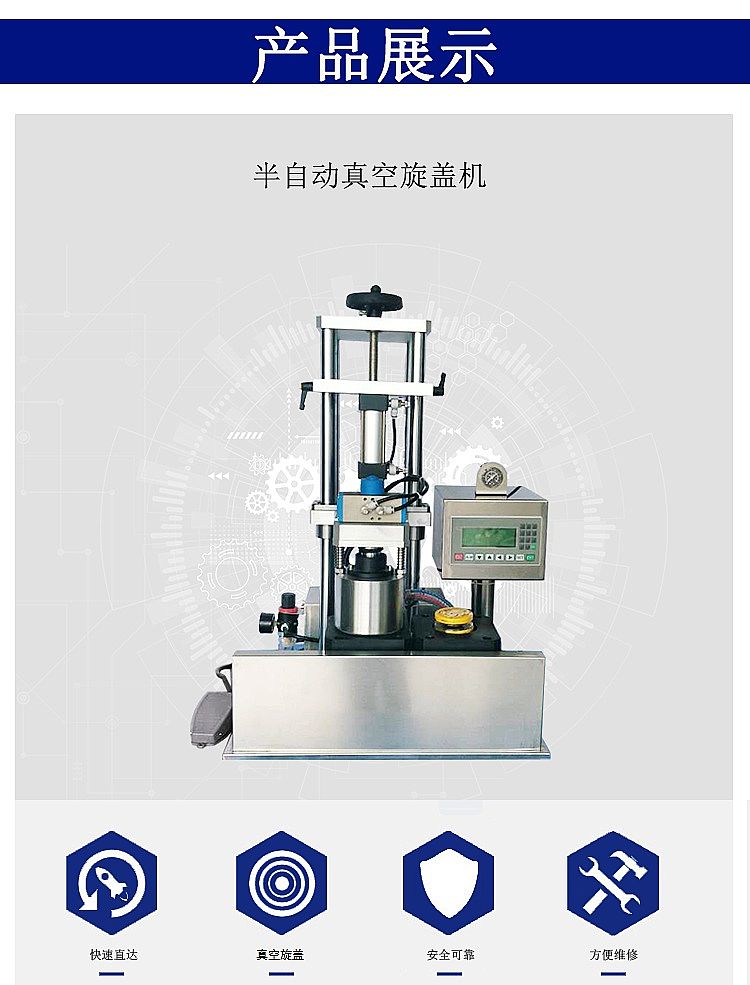 半自動真空旋蓋機全稱為半自動雙頭真空旋蓋機,集自動抽真空旋蓋于一體。其突出特點是雙工位的循復(fù)運動,比開關(guān)真空室操作更為簡單,節(jié)約時間提高效率。并采用人工送瓶,自動旋蓋,人工出瓶的工作模式,對物料本身起到了保護作用,降低了物料的耗損量。該半自動真空旋蓋機應(yīng)用范圍廣,包括醫(yī)藥、食品、日化、化工等行業(yè),專用于各種辣椒醬、番茄醬、罐頭、肉醬等瓶裝醬料物品的旋緊瓶蓋與抽真空。