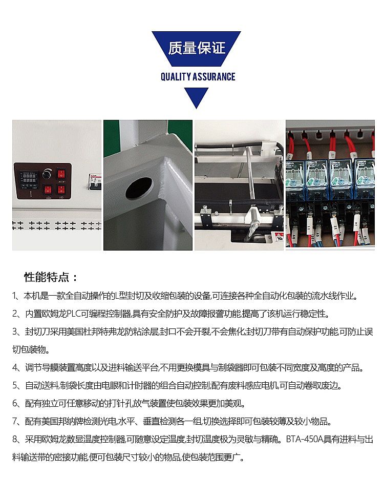 8.采用歐姆龍數(shù)顯溫度控制器,可隨意設(shè)定溫度,封切溫度較為靈敏與精確。BTA-450A具有進(jìn)料與出料輸送帶的密接功能,便可包裝較小的物品,使包裝范圍更廣。