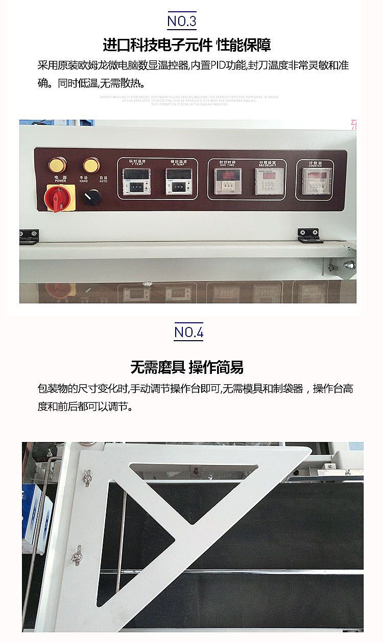 3.進(jìn)口科技電子元件,性能保障:采用原裝歐姆龍微電腦數(shù)顯溫控器,內(nèi)置PLD功能,封刀溫度非常靈敏和準(zhǔn)確。同時(shí)低溫,無(wú)需散熱。