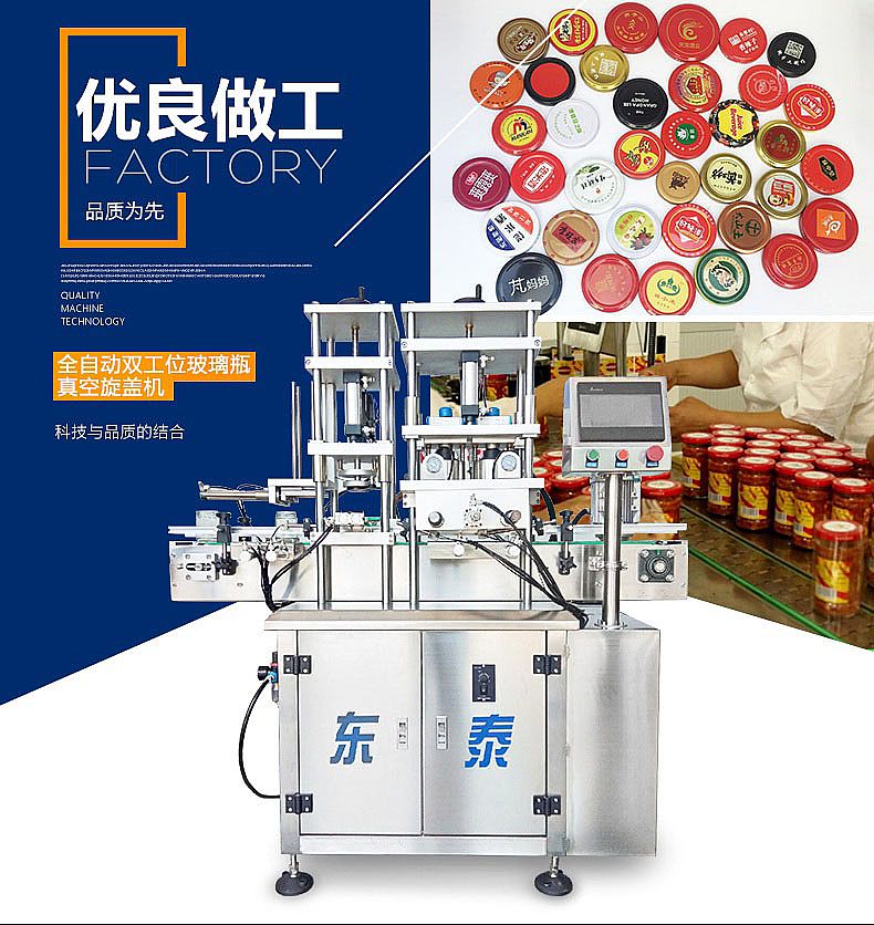 該機借鑒國外技術,結合客戶需求研發(fā)而成。該機集自動進瓶、自動理蓋上蓋、自動抽真空旋蓋、自動出瓶于一體,生產(chǎn)效率高,運行穩(wěn)定可靠,是食品醬料、飲料、保健品等行業(yè)馬口鐵三(四)旋蓋理想的抽真空旋蓋設備。