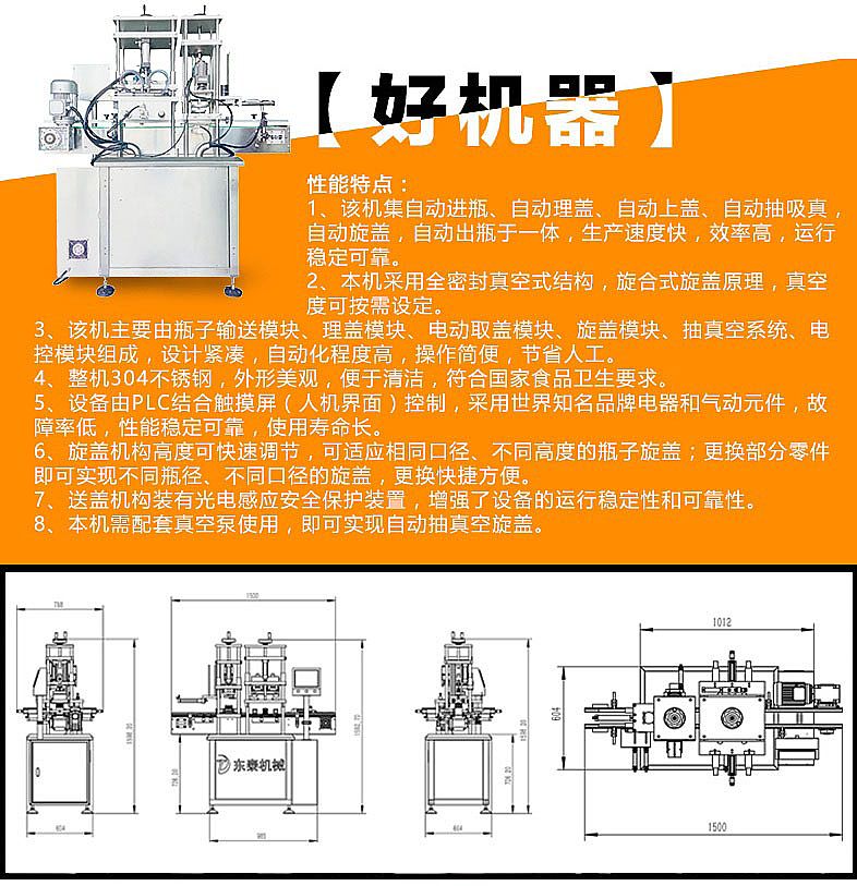 1.該機集自動進瓶、自動理瓶、自動上蓋、自動抽真空、自動旋蓋、自動出瓶于一體,生產(chǎn)速度快,效率高,運行穩(wěn)定可靠。
