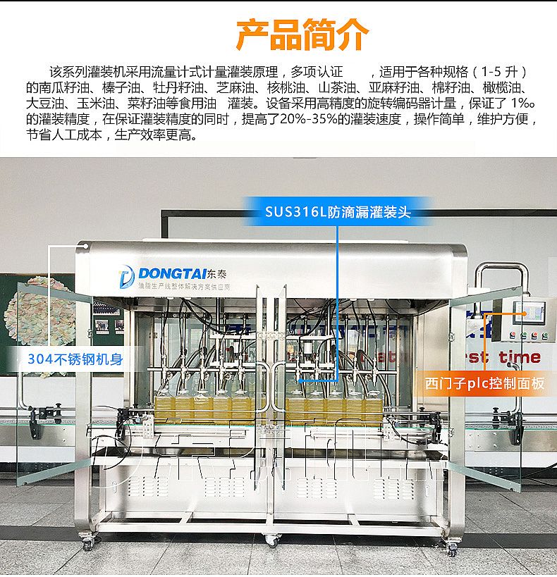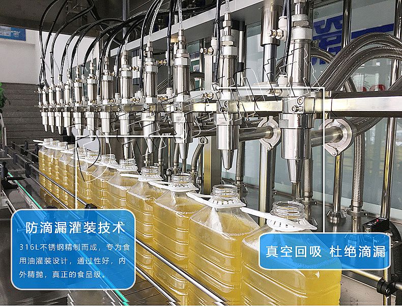 該系列灌裝機(jī)采用流量計(jì)式計(jì)量灌裝原理,多項(xiàng)認(rèn)證,適用于各種規(guī)格(1-5升)的南瓜籽油、榛子油、牡丹籽油、芝麻油、核桃油、山茶油、亞麻籽油、棉籽油、橄欖油、大豆油、玉米油、菜籽油等食用油灌裝。設(shè)備采用高精的旋轉(zhuǎn)編碼器計(jì)量,保證了1%o的灌裝精度,在保證灌裝精度的同時(shí),提高了20%-35%的灌裝速度,操作簡(jiǎn)單,維護(hù)方便,節(jié)省人工成本,生產(chǎn)效率更高。