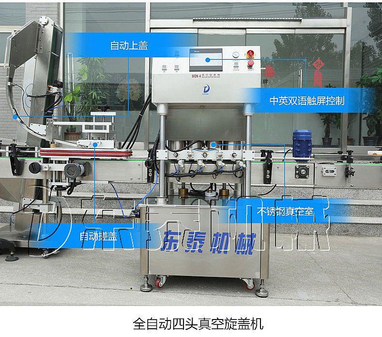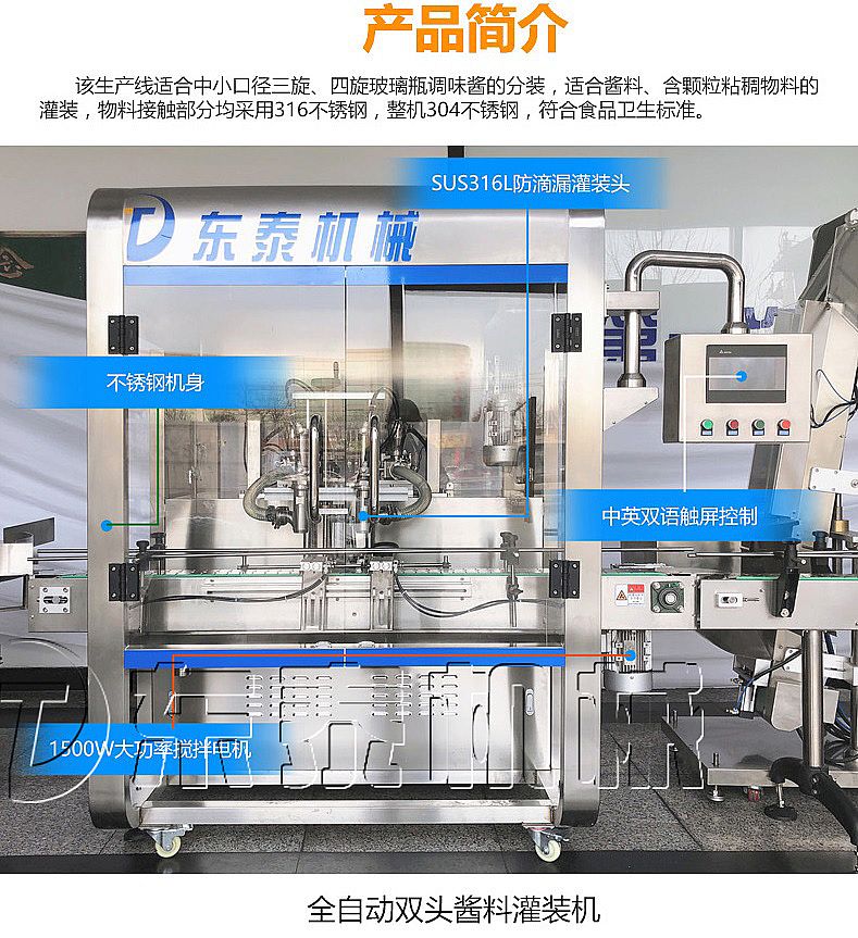 該生產(chǎn)線適合中小口徑三旋、四旋玻璃瓶調(diào)味醬的分裝,適合醬料、含顆粒黏稠物料的灌裝,物料接觸部分均采用316不銹鋼,整機(jī)304不銹鋼,符合食品衛(wèi)生標(biāo)準(zhǔn)。該機(jī)設(shè)計(jì)合理,機(jī)型小巧,立式結(jié)構(gòu),節(jié)省場(chǎng)地,操作方便。啟動(dòng)部分均采用德國(guó)FESTO和臺(tái)灣AirTack的氣動(dòng)元件。灌裝閥有氣動(dòng)閥控制,灌裝精度更高,灌裝量和灌裝速度均可任意調(diào)整,灌裝悶頭采用防拉絲及升降灌裝裝置。
